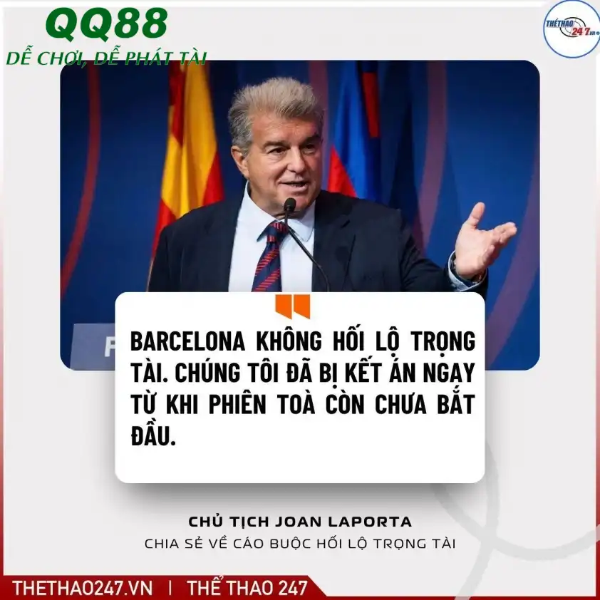 Không chỉ có cựu chủ tịch, chủ tịch đương nhiệm của Barca, ông Joan Laporta, cũng đã lên tiếng bảo vệ CLB của mình. Ông ấy khẳng định mạnh mẽ rằng Barcelona hoàn toàn trong sạch, không hề có chuyện “mua trọng tài” hay bất kỳ hành vi phi thể thao nào. Lời chỉ trích nhắm vào CLB là hoàn toàn vô căn cứ và mang tính “vu khống”. Lập trường của cả hai vị lãnh đạo Barca rõ ràng là rất kiên quyết, không muốn để đối thủ có cơ hội moi móc thêm bất kỳ thông tin nào bất lợi cho đội bóng.